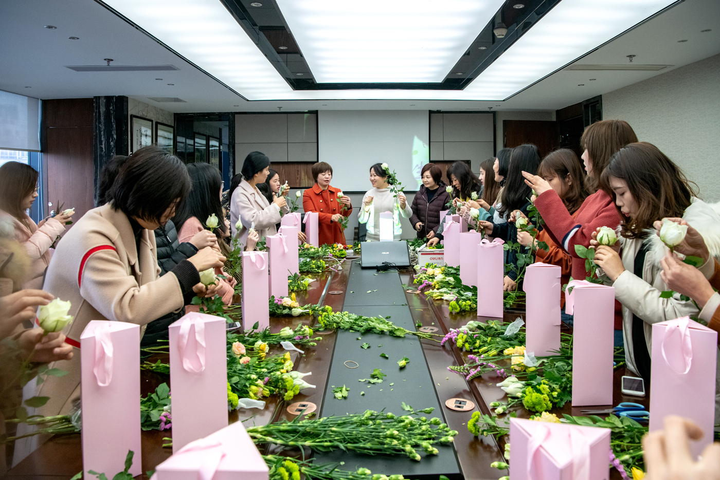 插花活动开始前,公司工会主席方剑玲首先向全体女员工致以节日的祝贺,对女员工在各工作岗位上发挥的作用,表示充分肯定,并希望大家继续努力,创新思维,积极工作,争取更大的贡献。陈总代表行政领导向公司所有女员工致以节日的问候,表示工会组织的“欢庆三八,创意花样人生”主题活动很有意义,并预祝活动成功。陈顾问还朗读了陈总转发的“女人赞”,为主题活动增色不少。