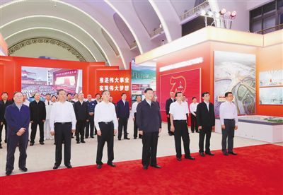 下午4时10分许,习近平等党和国家领导同志来到北京展览馆,步入展厅参观展览。展览以开辟和发展中国特色社会主义道路、建设社会主义现代化国家为主题,以编年体为时间主线,安排设计了5个部分,并体现历次党代会和重要中央全会、五年规划(计划)等方面的跨段主线,选择150个“新中国第一”进行展示,每10年设置英雄模范人物墙,充分运用声光电等多媒体科技展示手段,全方位立体化呈现新中国成立70年来中国共产党领导中国人民发愤图强、艰苦奋斗实现的伟大跨越,清晰展现党的领导和我国社会主义制度集中力量办大事的政治优势,深刻揭示新中国70年巨变背后的深刻道理。