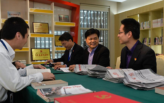 在亨通集团党员服务中心阅览室,崔根良(右二)和党员们一起学习交流。 新华社记者 季春鹏摄