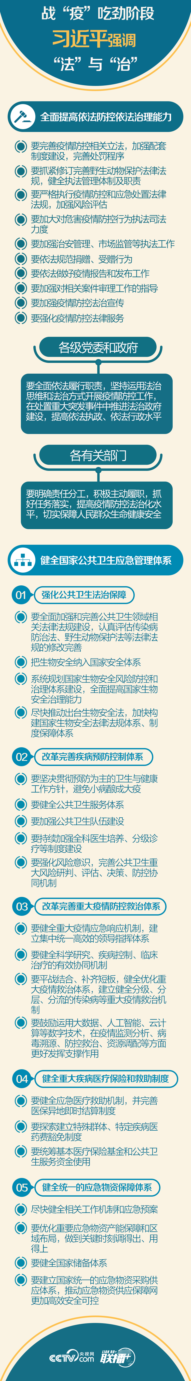 文中详述了习近平关于依法防控和健全国家公共卫生应急管理体系的具体部署。央视网《联播+》从“法”与“治”两个层次进行梳理,以飨读者。