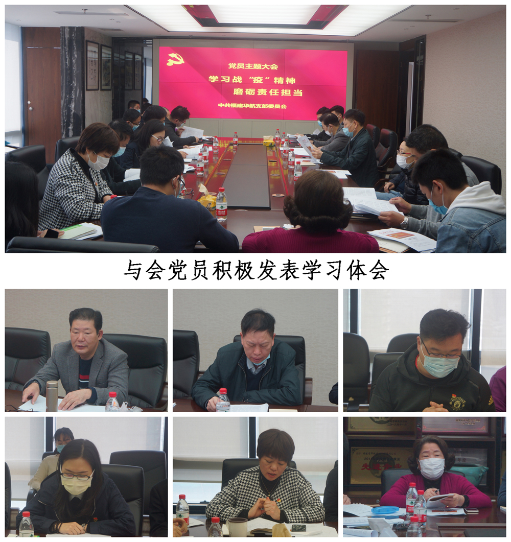 与会党员一致表示,当前正处于“疫情防控、复工复产”的关键期,要以抗“疫”英雄勇于担当作为、敢于攻坚克难的大无畏精神为榜样,把思想和行动统一到党中央“疫情防控、复工复产”两手抓的部署上来。2020年时间已过四分之一,公司在复工复产方面任务十分繁重,要千方百计把被疫情耽搁的时间抢回来,这对企业、党员、员工,在政治素质、能力上也是一场大考,关键时刻作为党员要经受考验。与会党员围绕主题积极发言,纷纷表示,要学习抗疫精神,以实际行动在疫情防控和复工复产中带好头、做表率;要传承华航优良传统,立足创新发展,吃苦耐劳、敢打硬仗、讲担当、比作为,为完成公司全年的目标任务,充分发挥共产党员先锋模范作用;要把加强民营企业党建工作融入企业发展,充分发挥支部战斗堡垒在“疫情防控、复工复产”中的政治优势,带领员工逆势而上,化“危”为“机”......
