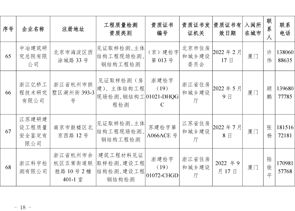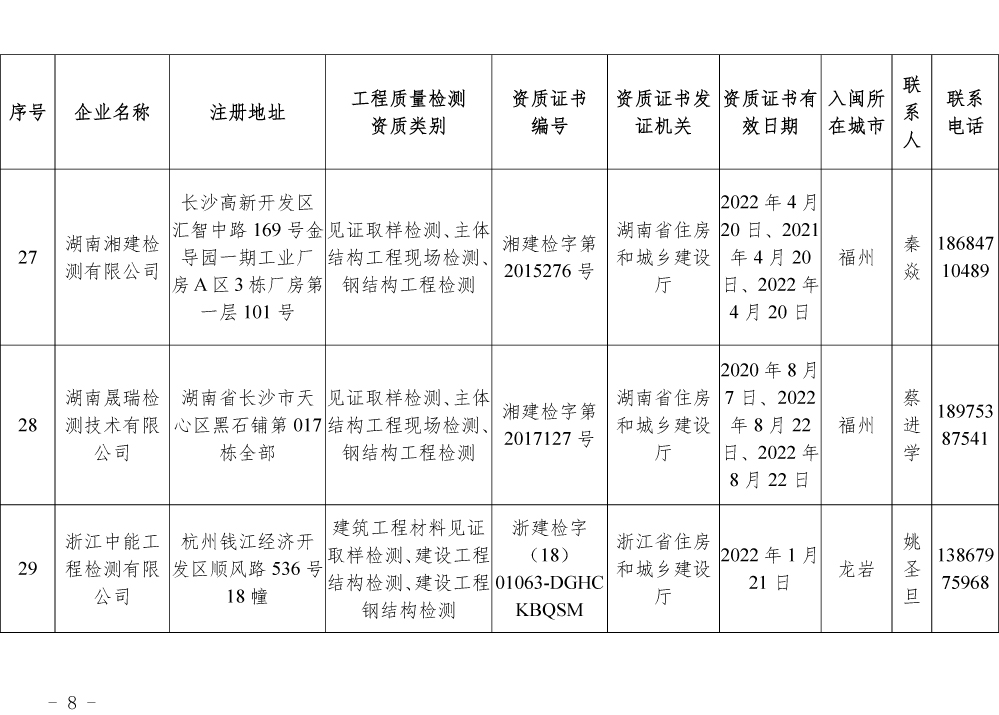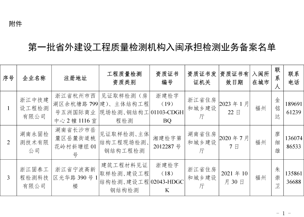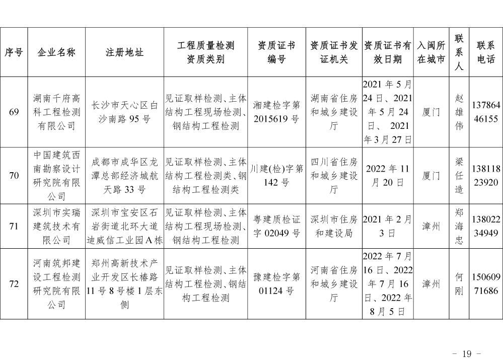 为更好的支持和服务我省房屋安全鉴定工作,截止5月底,共计74家省外建设工程质量检测机构已按照《建设工程质量检测管理办法》(住建部令第141号)有关规定,在我厅办理入闽承担检测业务备案手续,现将74家检测机构名单予以公布。