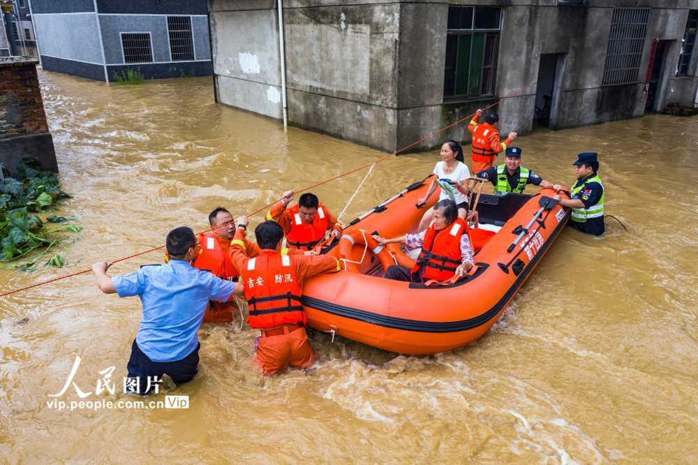 2020年7月10日,江西省吉安市新干县应急救援队正在沂江乡大洲村用皮筏艇转移两名受困群众。(李福孙/人民图片)