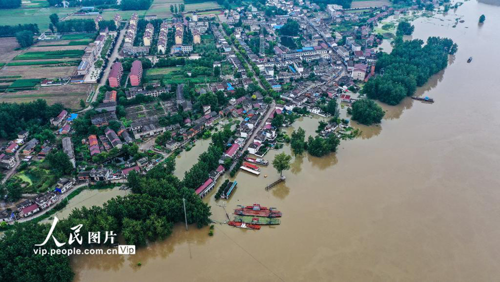 2020年7月11日,航拍下的安徽省铜陵市义安区胥坝乡沿岸已被江水淹没。(陈晨/人民图片)