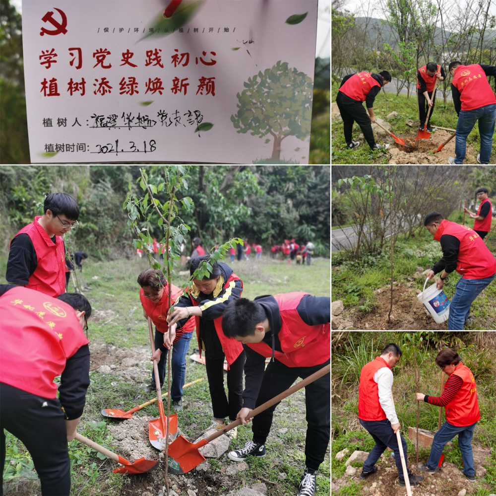 明媚春光里,党员同志们认真学习植树要领,挖坑、清石、放苗、培土、浇水……三人成组、五人成团,大家热情满满、干劲十足,一棵又一棵的樱花树苗在有条不紊的配合下迎风摇曳。
