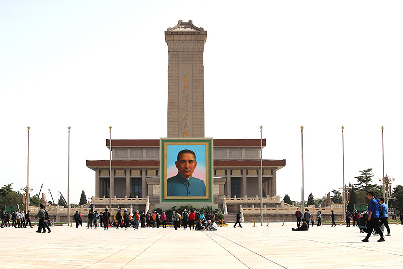2021年4月27日,孙中山巨幅画像亮相天安门广场,众多游客纷纷在孙中山画像前驻足拍照留影。