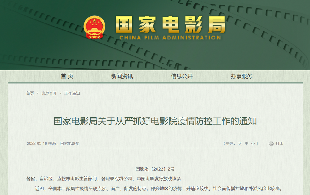 近期,全国本土聚集性疫情呈现点多、面广、频发的特点,部分地区的疫情上升速度较快,社会面传播扩散和外溢风险比较高。电影全行业要坚决贯彻落实党中央关于从严抓好疫情防控工作的决策部署,全力做好电影院疫情防控各项工作。现就有关事项通知如下。