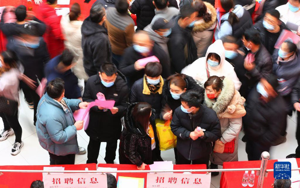 求职人员在山东省滕州市“春风送岗”春季人才招聘会上寻找就业岗位(2022年2月19日摄)。 新华社发(李志军 摄)