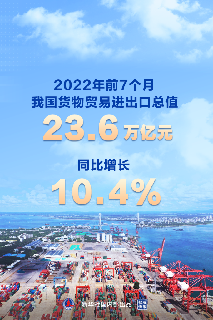 新华社北京8月7日电(记者邹多为)海关总署7日发布数据,今年前7个月,我国货物贸易进出口总值23.6万亿元,同比增长10.4%。外贸克服诸多不利影响,实现较快增长。