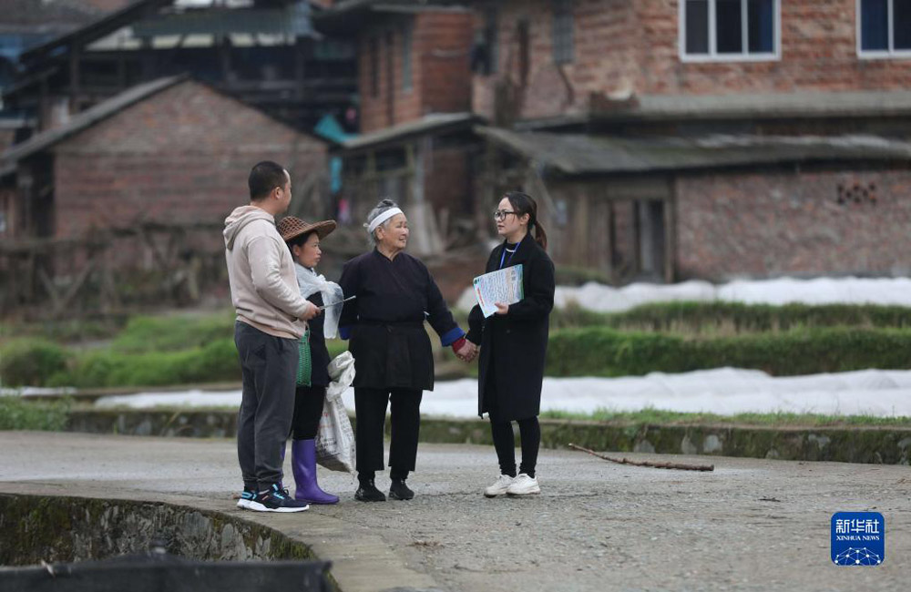 在广西柳州市三江侗族自治县良口乡南寨村,纪检监察干部(右一、左一)在了解惠农政策落实情况(2022年3月24日摄)。新华社记者 黄孝邦 摄