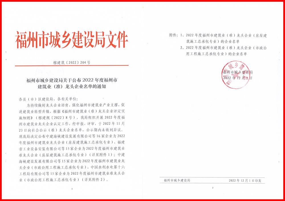2022年12月1日,2022年度福州市建筑业(准)龙头企业名单发布,福建华航建设集团获评2022年度福州市建筑业龙头企业(房屋建筑施工总承包专业、市政公用工程施工总承包专业)。连续两年被评选为福州市建筑业龙头企业,不仅是对福建华航建设集团经营成果的肯定和鼓励,更将进一步促进企业向前向好快步发展。