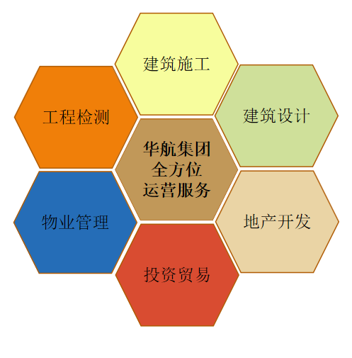 在四十多年的发展演进历程中,华航集团形成了较为完整的多元化综合型开发建设产业链,集团下设地产开发、建筑设计、投资贸易、工程检测、建筑劳务、物业管理等多家子公司。